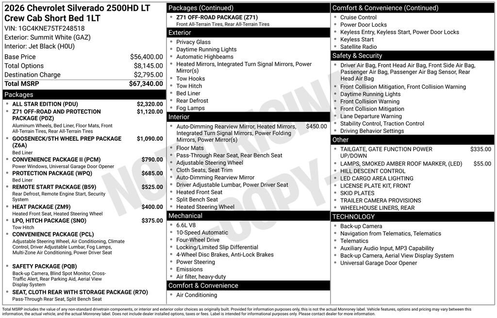 Built to handle tough jobs with confidence, our 2026 Chevrolet Silverado 2500HD LT Crew Cab 4X4 All Star Edition delivers serious power and capability in Sterling Gray Metallic. Motivated by a TurboCharged 6.6 Liter DuraMax Diesel V8 offering 470hp and 975lb-ft of torque to a 10 Speed Allison Automatic transmission for muscular towing and hauling capabilities. An HD suspension and auto-locking rear differential help you handle hard work without breaking a sweat, and this Four Wheel Drive truck stands strong with an impressive range of standard features. Highlights include chrome bumpers, alloy wheels, power-trailing mirrors, an EZ-lift and lower tailgate, LED tail lamps, side/rear bed steps, a trailer hitch, and cargo-bed lighting.Our LT cabin is configured for long workdays with our package's comfortable cloth seating, heated front seats, a ten-way power-adjustable driver's seat, a heated wrapped steering wheel, dual-zone climate control, cruise control, keyless access with pushbutton ignition, and practical storage throughout the cabin. Technology is anchored by a 13.4-inch center touchscreen and a 12.3-inch digital driver display, providing Google built-in compatibility, WiFi connectivity, wireless Apple CarPlay/Android Auto, Bluetooth, and SiriusXM-compatible audio.Chevrolet raises the safety bar by providing automatic braking, forward collision alert, a following distance indicator, an HD rearview camera, a bed-view camera, front and rear park assist, hitch guidance, trailer sway control, hill start assistance, and more. Drive our Silverado 2500HD LT and feel ready to do it all! Save this Page and Call for Availability. We Know You Will Enjoy Your Test Drive Towards Ownership! Price includes: Processing Fee, $1000 - Chevrolet Consumer Cash Program. Exp. 04/30/2026