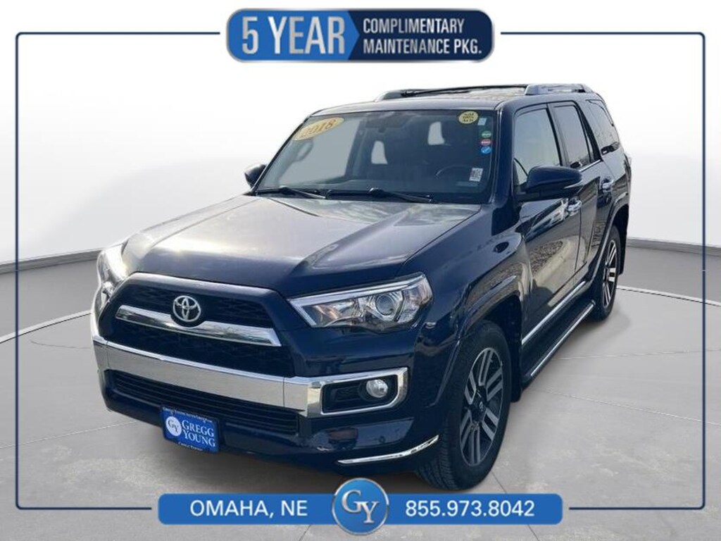 Why BUY from Gregg Young Chevy Omaha? When you choose this Nautical Blue Metallic 2018 Toyota 4Runner Limited with 152,189 miles, you are not just buying a used vehicle - you are investing in quality, reliability and peace of mind. Our clientele depend on us for Transparent Pricing, Convenience and, most importantly, Customer FIRST Service! All purchases include 5 year Complimentary Maintenance Package, valued at over $1,000! What this vehicle includes: Limited PackageRight and Left Individual Air ConditionerAuto-Dimming Rearview MirrorLeather Seat TrimBody Color Heated MirrorsGarage Door OpenerMoonroof with Tilt Up and SlideEntune Premium JBL Audio with NavigationP245/60R20 Mud and Snow Tires20" X 7.5" Unique Dual 6-Spoke Alloy Wheels Comfort Ventilated front seats -Thats cool. Ventilated front seats provides targeted cool air so you and your passenger can get comfortable quicker in hot weather. Getting comfortable is no sweat when you have ventilated front seats.Convenience Cruise control with steering wheel mounted controls. Set it and forget it. Road trips used to be stressful, until cruise control set the pace. Simply set the desired speed using the steering wheel mounted controls and it will maintain that speed without driver intervention. This can help minimize driver fatigue and improve overall fuel economy. Resting your right foot is right at your fingertips thanks to cruise control with steering wheel mounted controls.Safety and Security Rear camera - Watching your back! The rear camera helps you see obstacles and hazards you otherwise couldn't by showing enhanced images of what is behind you. The rear camera is an extra set of eyes that's both convenient and safe. Brake assist - Stop right there. Something jumps out into the middle of the road and you need to stop now! With brake assist, you will. It uses the speed of the brake pedals travel to sense panic braking, then applies all available power to boost your stopping power. Brake assist can stop the accident before it is one.Technology and Telematics Selective Internet access - a more focused delivery. Selective internet access allows you to tailor the features for your feed, such as sports scores, local news, or current weather. When it comes to getting what you want, selective internet access is a net gain. NAUTICAL BLUE METALLIC, BLACK GRAPHITE, LEATHER SEAT TRIM When you choose a Certified Pre-Owned vehicle from Gregg Young, youre not just buying a used car youre getting extra protection, added peace of mind, and built-in value you wont find with an ordinary pre-owned vehicle. Every Certified Pre-Owned vehicle must pass an extensive 172-point inspection performed by trained technicians. From engine and transmission performance to interior quality, safety features, and road-test standards, we verify the vehicle meets strict certification requirements before it ever reaches our lot. Ask if this vehicle qualifies for our Certified Pre-Owned Program 12-Month / 12,000-Mile Premier Coverage Drive confidently from day one. Our Premier Warranty* protects you against unexpected repairs for your first 12 months or 12,000 miles. Whats covered? Practically all major vehicle components (excluding maintenance items and wear-and-tear parts) Electrical, mechanical, interior, exterior, and more giving you true peace of mind with your purchase. 36-Month / 100,000-Mile Powertrain Protection Our Certified Powertrain Warranty** keeps you covered long after you leave the dealership, protecting many of your vehicles most important and expensive components for up to 36 months or 100,000 miles. What's covered? Engine Parts Transmission/Transaxle Parts Drive Axle Parts Hybrid Components Transfer Case Components Come on in to Gregg Young Chevy Omaha today at 17750 Burt St Omaha NE 68118 or call (888) 617-6478 to schedule a test drive! What sets Gregg Young Chevrolet of Omaha apart? Family-run leadership Gregg Young and his children actively manage the dealership, blending experience wi
